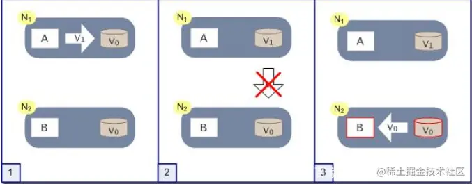 小明在访问节点N1的时候更改了V0到V1,想要小华访问节点N2的V数据库的时候是V1,因此需要等网络故障恢复,将N2节点的数据库进行更新才可以。