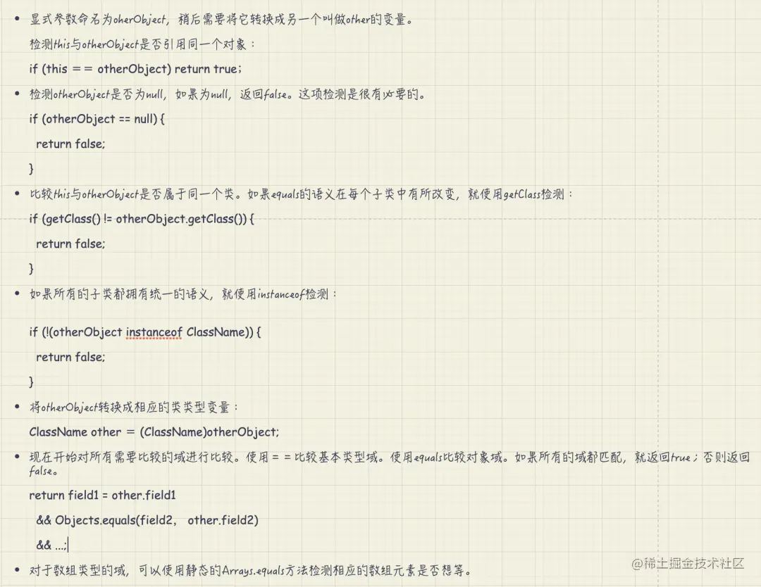 2.equals()和hashCode()需要同时覆盖,而且定义必须一致,也就是说equals比较了哪些域,hashCode就会对哪些域进行hash值的处理。