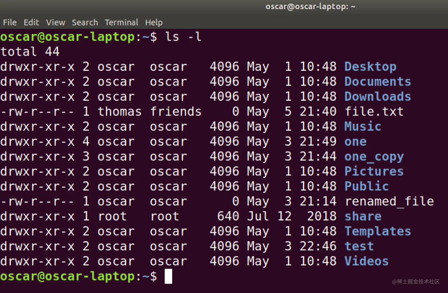 - r-- 表明文件所在的群组(此处是 oscar)的其他用户(除了 oscar 之外)只可以读此文件,但不能写也不能执行;