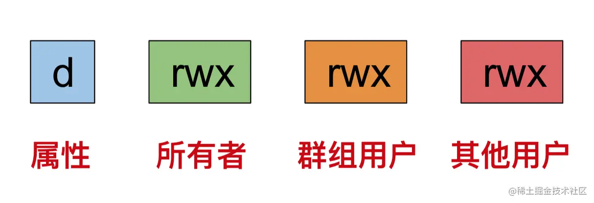 那为什么会有好多重复的 rwx 呢?rwx 代表的就是文件的读写和执行权限,某一个文件详细信息中每一组 rwx 就代表文件的所有者和群组用户或者群组之外的用户对本文件的读写和执行权限。