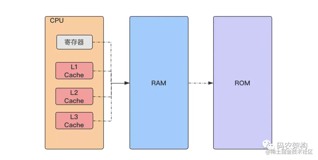 机器的四种存储介质是有关系的,一般程序运行时会将ROM相关的程序数据都读进RAM中,而需要运算的数据或运算过程中即将要用到的数据则会被读进高速缓存或寄存器中。假如要进行的运算所需要的所有数据及指令都在寄存器和高速缓存中,则这个运算过程则表现得非常平坦。此时不存在性能瓶颈,因为运算速度跟读取速度基本匹配。