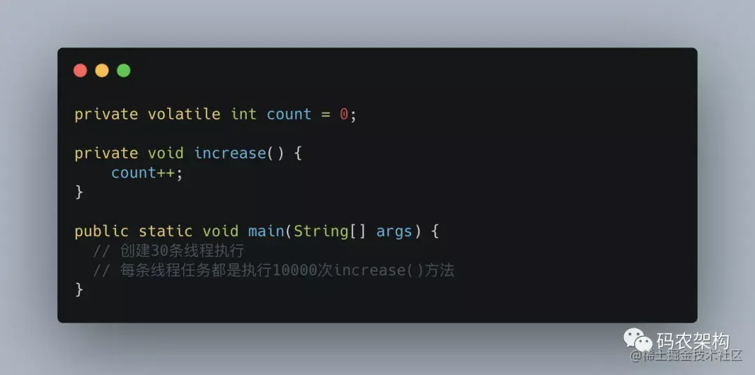 导致这个问题的原因其实是因为volatile不具备锁操作,要解决此问题其实不难,就是将这这些操作变为原子操作。即保证线程一完成之前不能有其他线程读取count变量,要达到目的只需对count变量加一个互斥锁即可。线程一执行前对count加锁,其他线程无法对count进行访问。线程一执行完后释放锁,此刻开始才允许其他线程获取此变量。