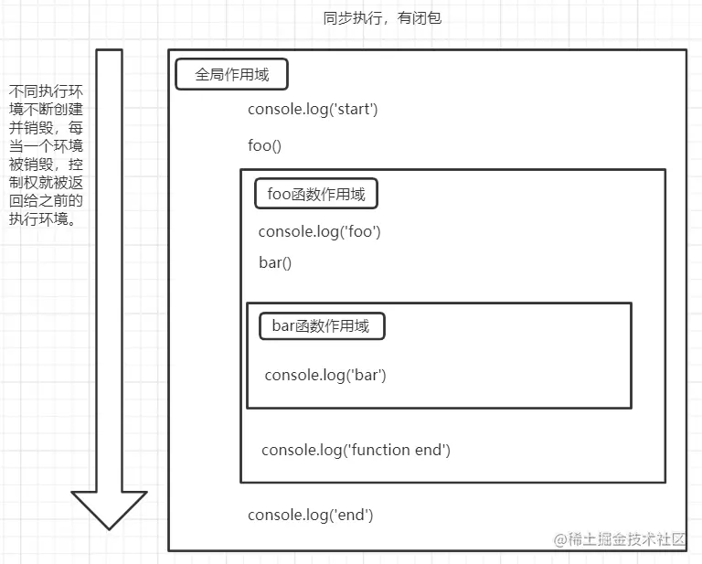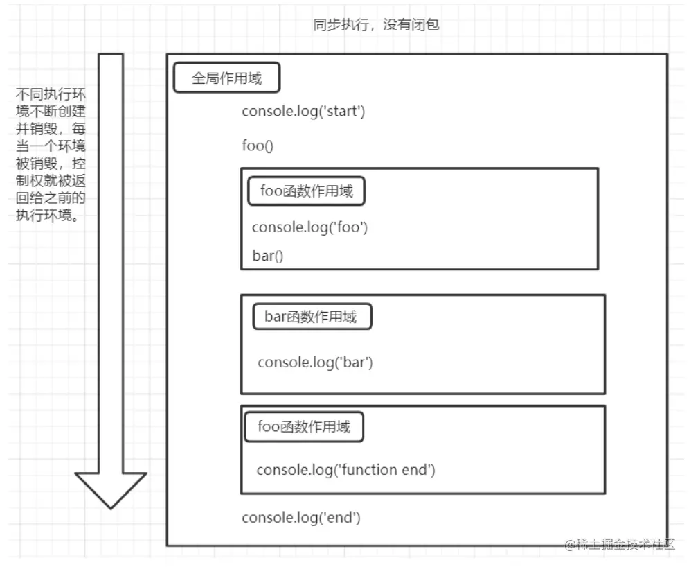 调用一个函数之后,会在当前作用域中执行完这个函数后,再执行当前作用域的其他内容。