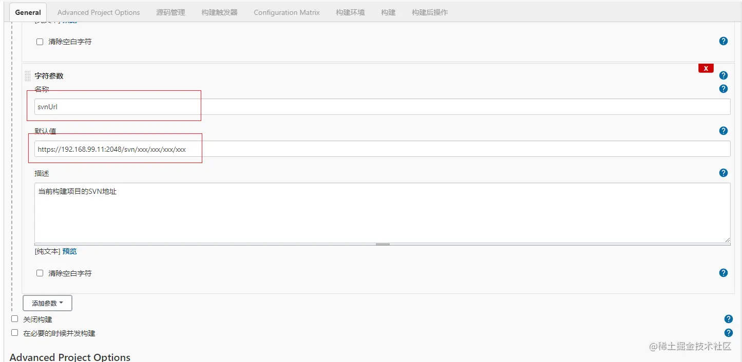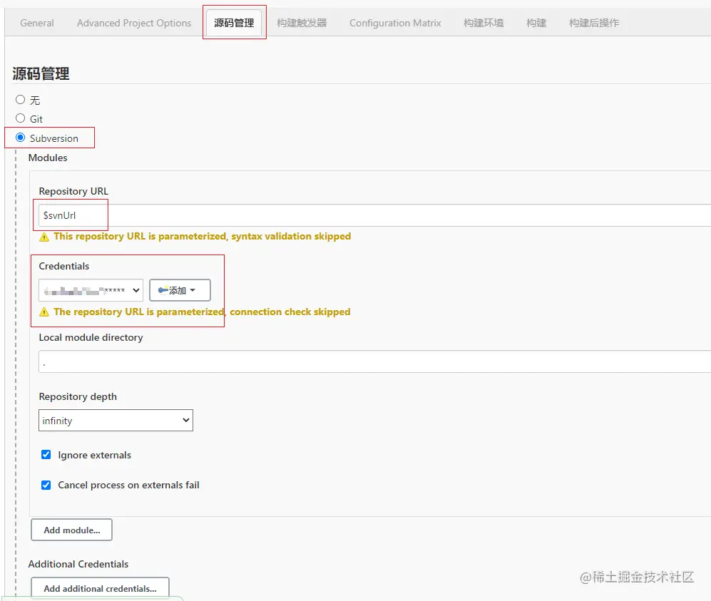 由于是代码版本控制工具是SVN,需要选择 Subversion 选项,在 Repository URL 中填入变量 $svnUrl。代表构建时使用传入的地址参数。