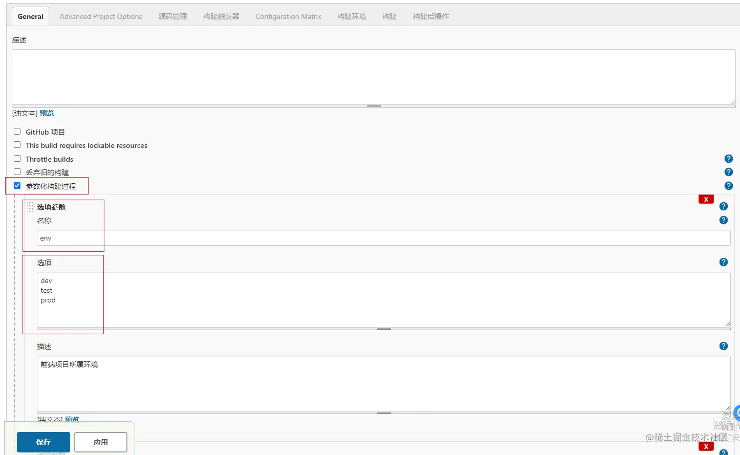 添加参数化构建过程,用于处理不同情况处理的构建。这边需要关注两个参数 env, svnUrl,对应着:构建及发布环境、构建的svn版本号。