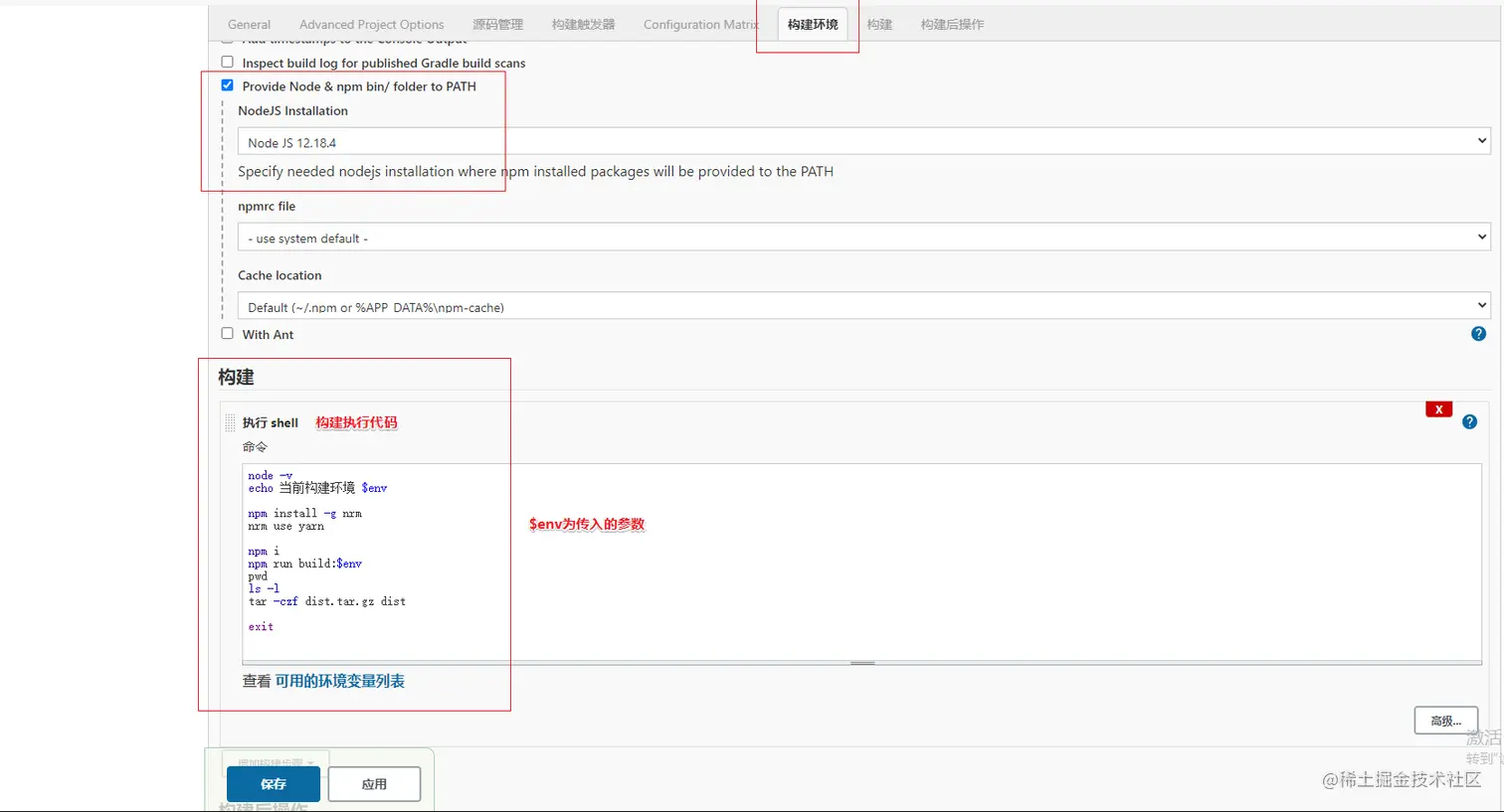 此处的命令负责打印常见信息,并执行构建命令。在构建结束后将 dist 文件夹的内容压缩成压缩包:"dist.tar.gz"