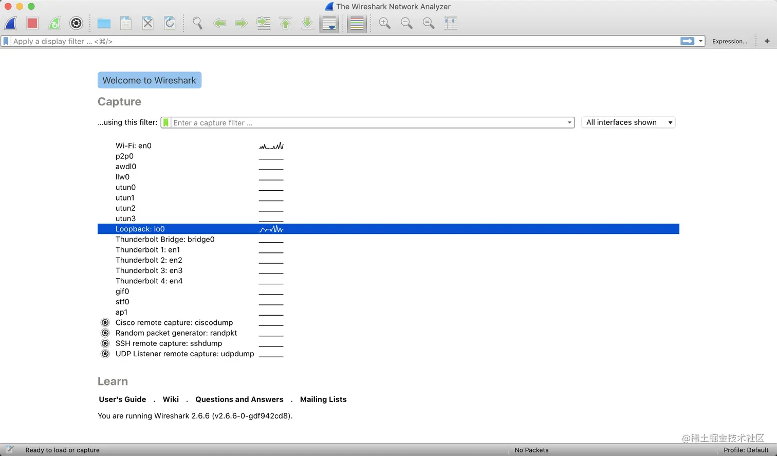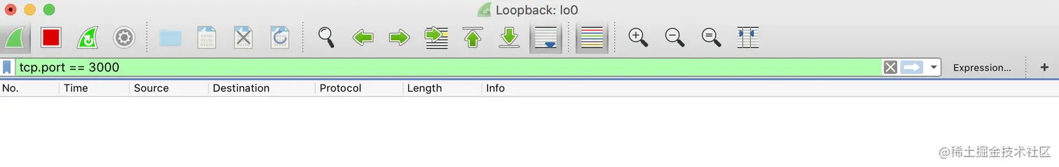 2、Wireshark首页,选择 “loopback lo0”,然后在顶部的过滤器中输入 tcp.port == 3000