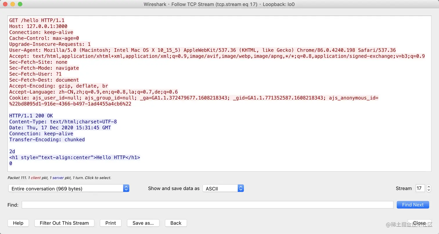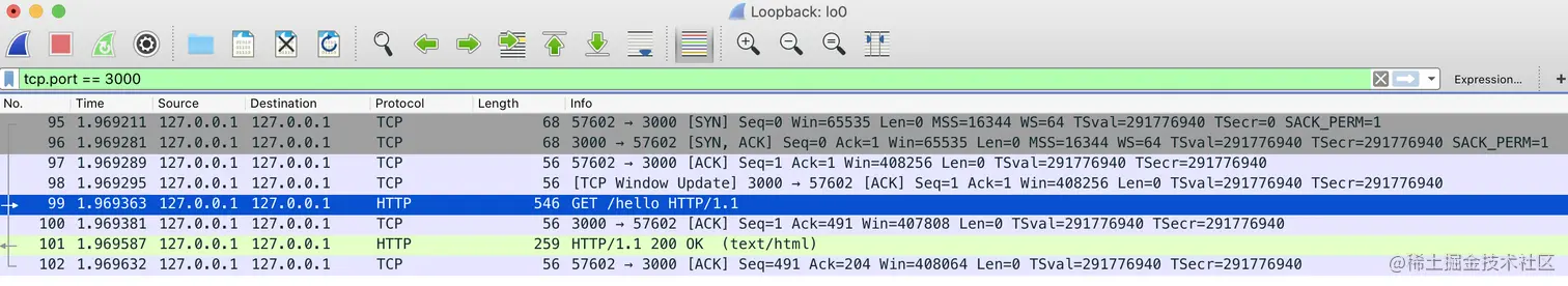 其中,客户端和服务器在同一台机器而没有与实际设备连接, “loopback lo0”作为回环网卡并不真实地从外界接收和发送数据包,lo 是 local 的简写。
