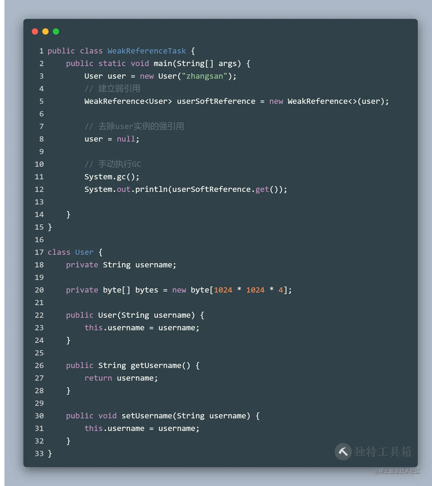 从输出中可以看到,在手动强制进行GC之后,有明显大概4M空间的回收,且我们获取到的user是null,说明再本次GC中,我们的弱引用对象被回收了。