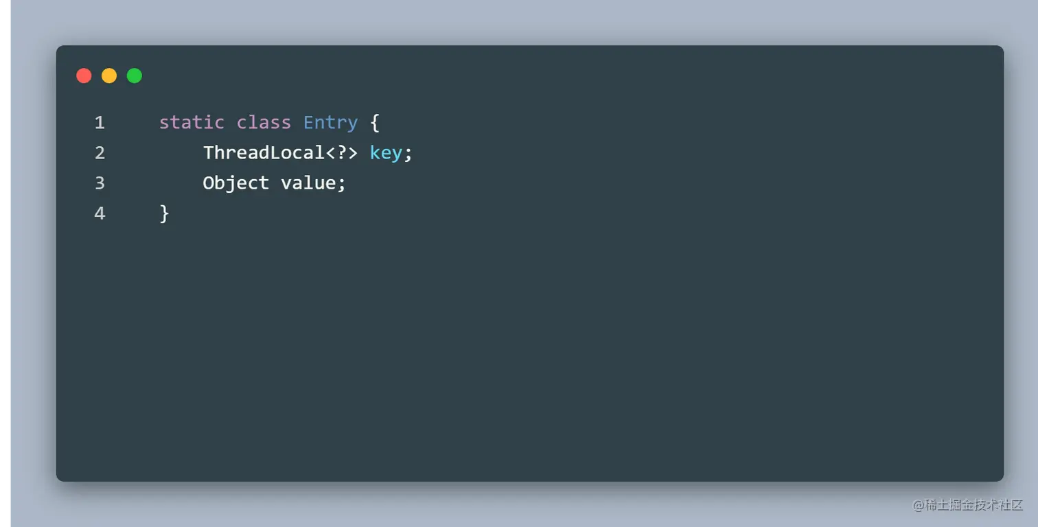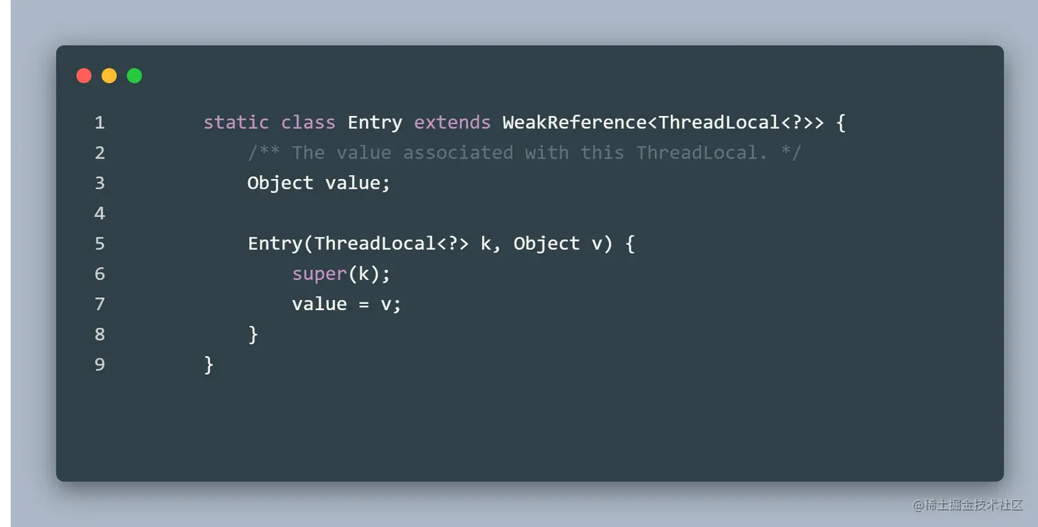 每一个线程都会有一个ThreadLocal.ThreadLocalMap,ThreadLocalMap底层其实就是一个Entry数组,Entry的key就是ThreadLocal,value就是我们要的只能被当前线程访问的对象了。注意到这个Entry继承了WeakReference,并且此弱引用表示的类型就是我们Entry的key,也就是ThreadLocal对象,首先来假设一下如果不按照上面这么写,我们可能怎么去设计Entry?