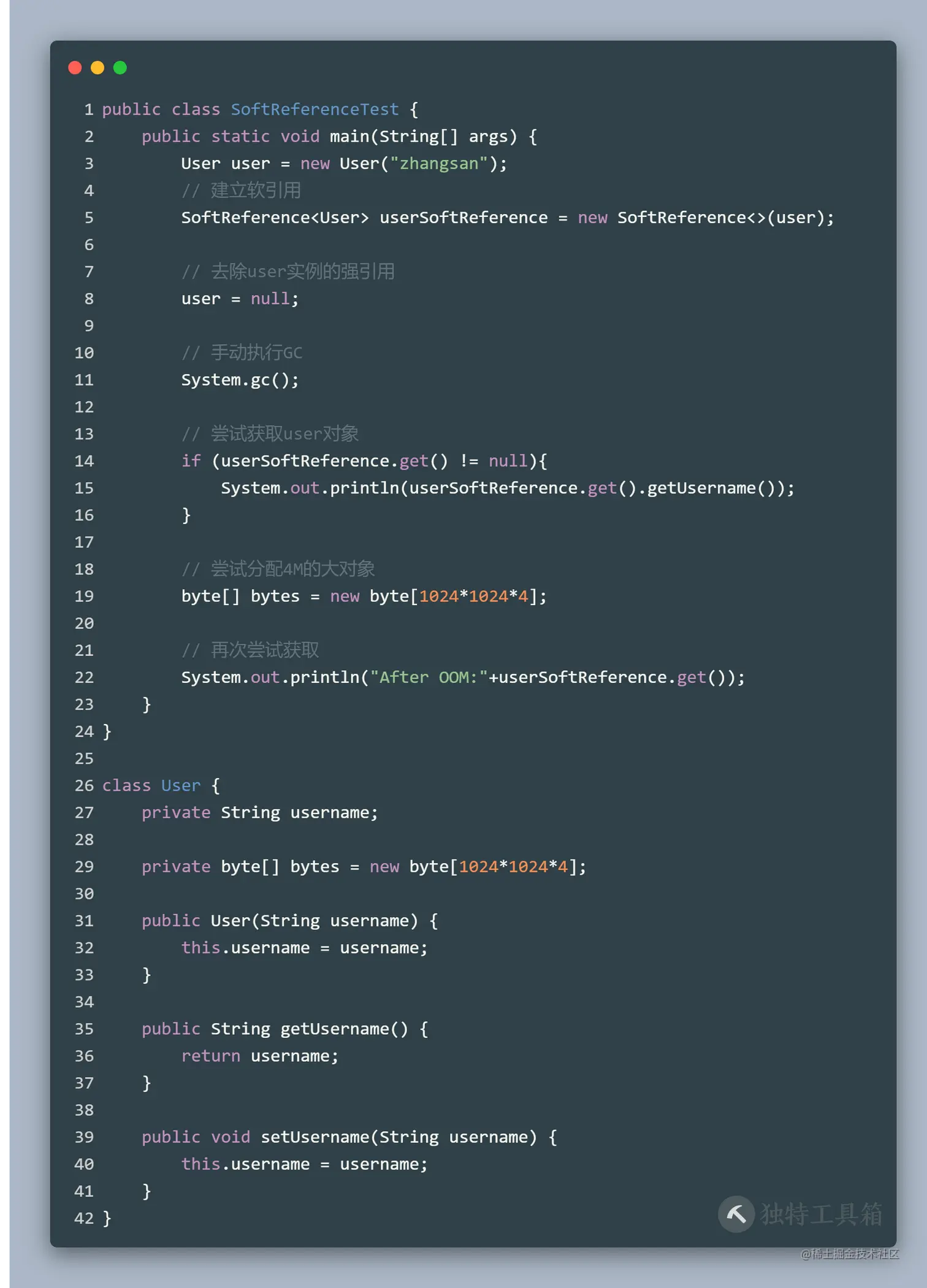 第一部分:在main程序中首先新建了一个User对象,在User对象内部持有一个4M大小的字节数组,暂且就认为这个对象实例大小为4M(当然肯定大于4M),然后为新建的User实例建立软引用后,去除该User对象实例的强引用。此时通过System.gc()手动进行垃圾回收的触发之后,可见依然能够获取到user对象实例的内容,说明虽然发生了垃圾回收,但是其实此时内存充足,并不会回收软引用。 第二部分:紧接着第一部分,然后再次尝试分配4M大小的字节数组,由于我们的堆大小只有7M,所以此时肯定无法分配,系统将触发GC,触发GC之后,可以从回收日志看到大约回收了4M的空间(即我们的软引用对象),使得新分配的4M字节数组可以容纳。并且在这之后,软引用对象获取到的是NULL。