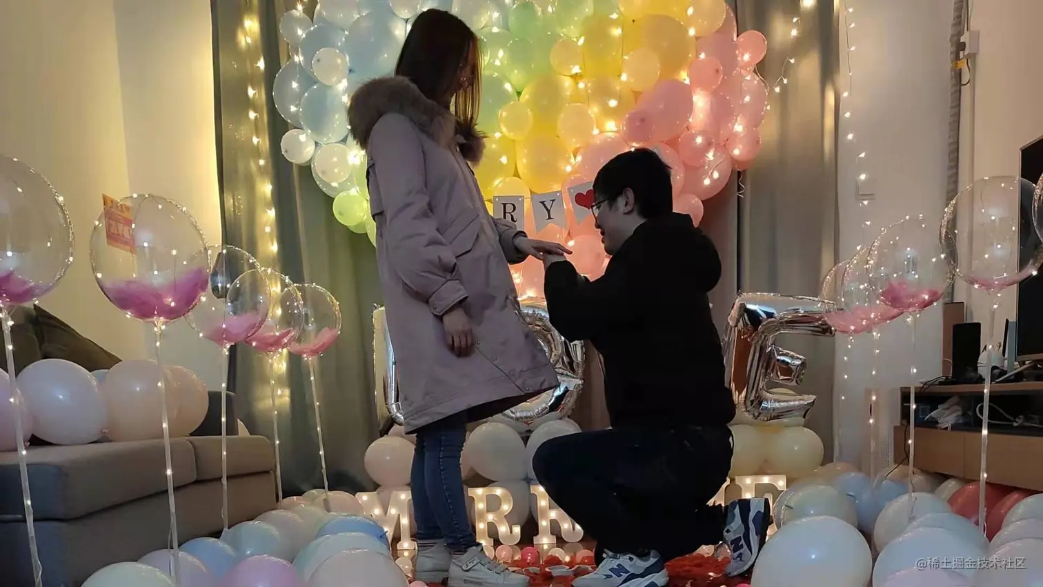 首先,我要恭喜你找到了能与你共度余生的人,你们决定明年5月份结婚。今年12月6日他向你求婚了,虽然你提前感知到了他要向你求婚,但是当你看到他为你准备的求婚仪式的时候你还是很感动,在那一瞬间你感动哭了,不过当他走到你面前单膝跪地的时候,你又笑了。他会给你准备惊喜,你也会给他准备惊喜,今年他过生日的时候你特意买了蛋糕、布置了房间、点了蜡烛,当他推开门的时候他高兴的跳了起来,你也感到很开心。