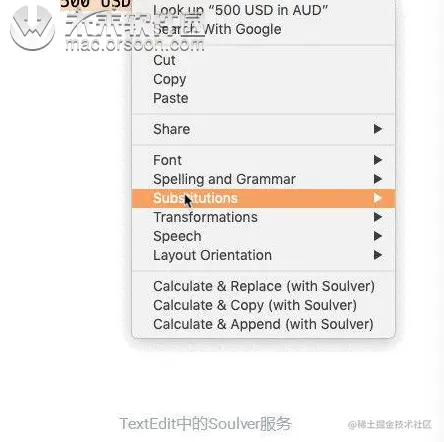 您实际上可以使用Soulver通过服务在macOS中的任何位置评估文本。只需在任何地方突出显示某些文本,右键单击并选择“服务”>“使用灵魂计算”。有三种服务:一种计算并将结果复制到剪贴板,一种用结果替换输入,一种附加结果。