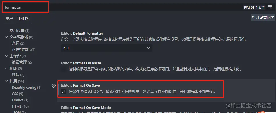 4:在工作区搜索format on save,并勾选上