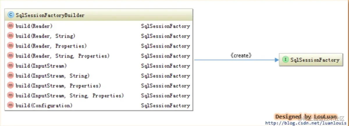 由于构造时参数不定,可以为其创建一个构造器Builder,将SqlSessionFactory的构建过程和表示分开: