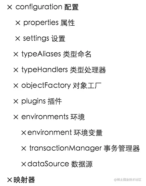 **任何框架的初始化,无非是加载自己运行时所需要的配置信息。**MyBatis的配置信息,大概包含以下信息,其高层级结构如下: