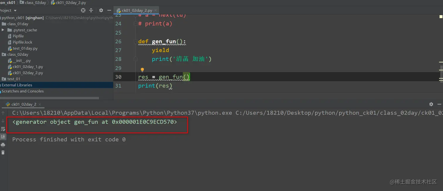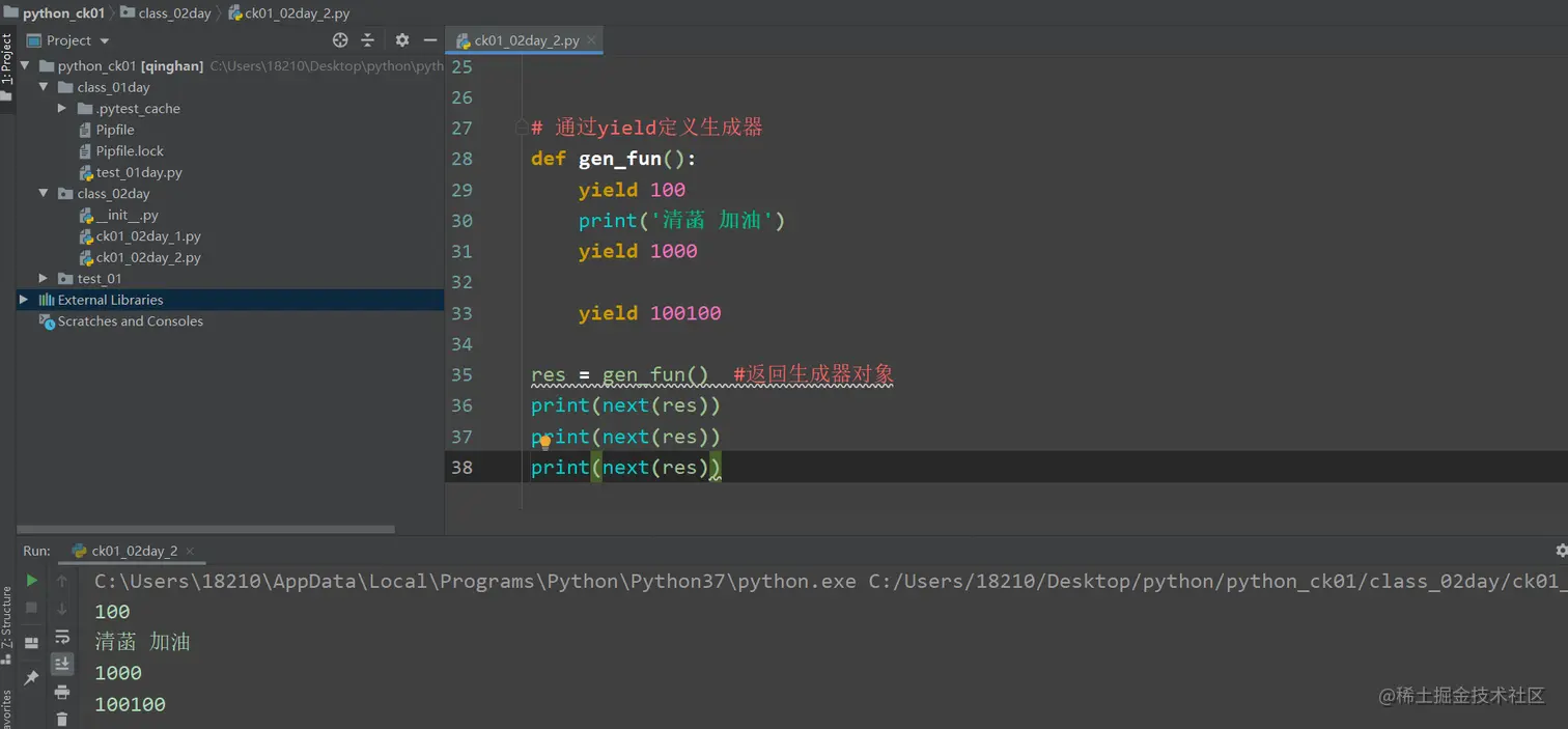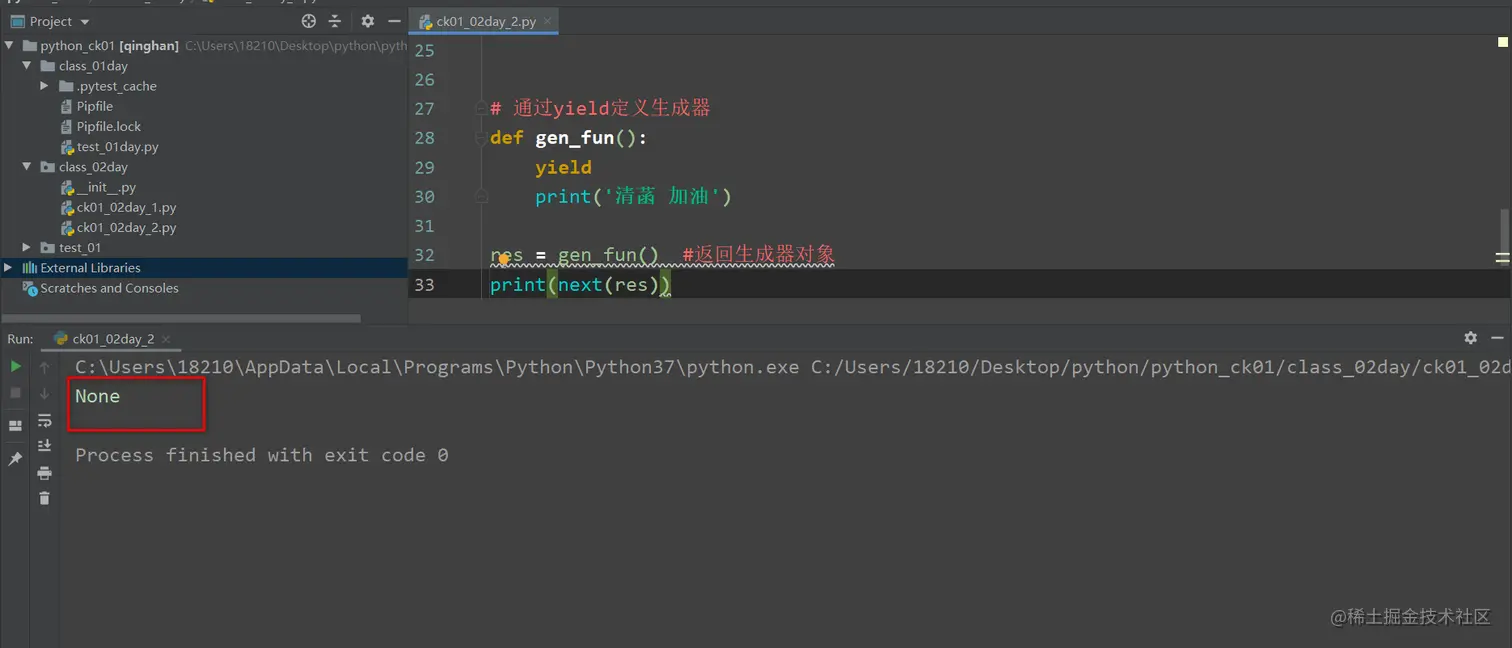 调用这个函数的时候,它会给你返回一个生成器对象。既然它是一个生成器对象,那么就可以通过next()来对它进行取值。