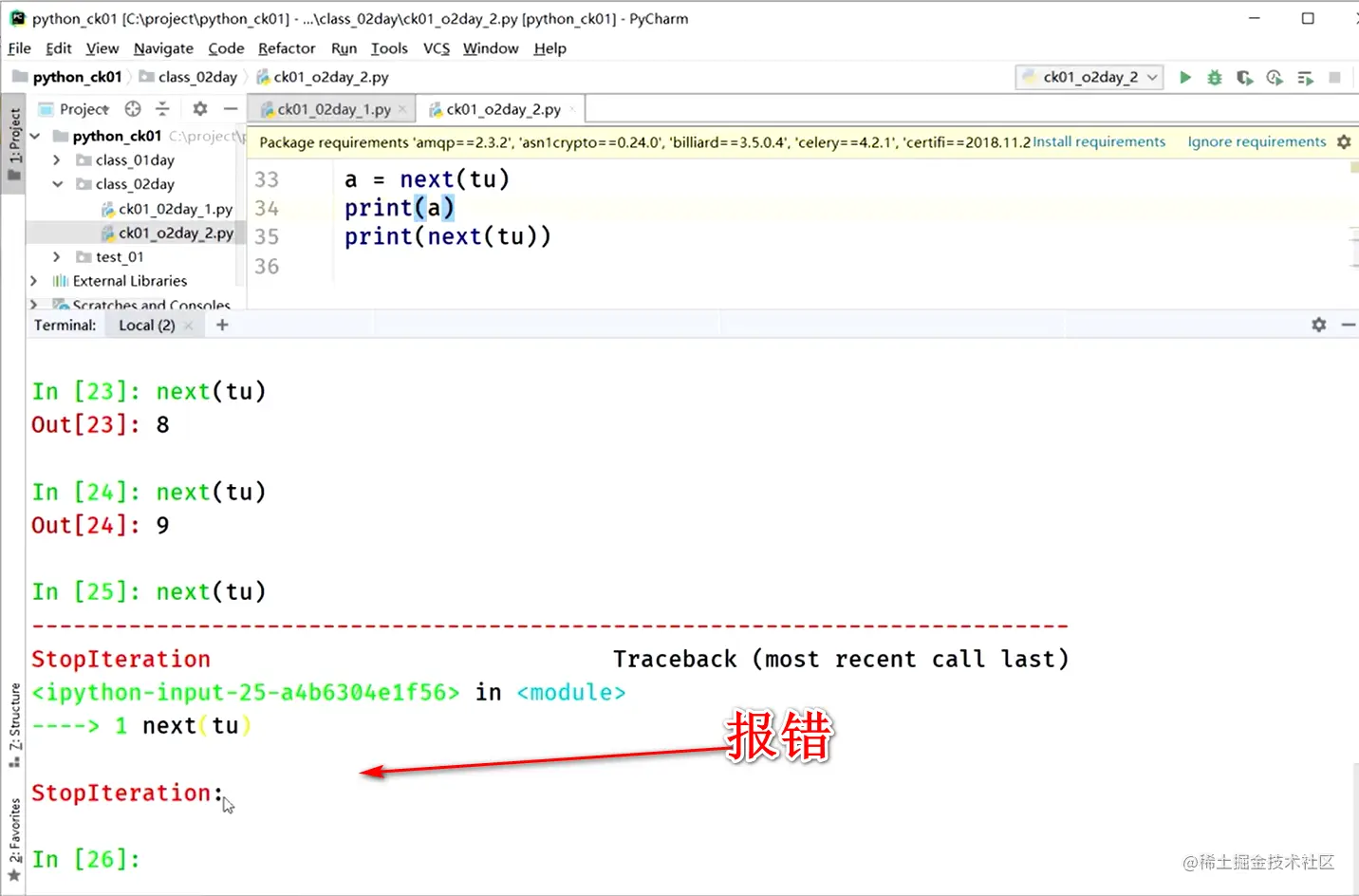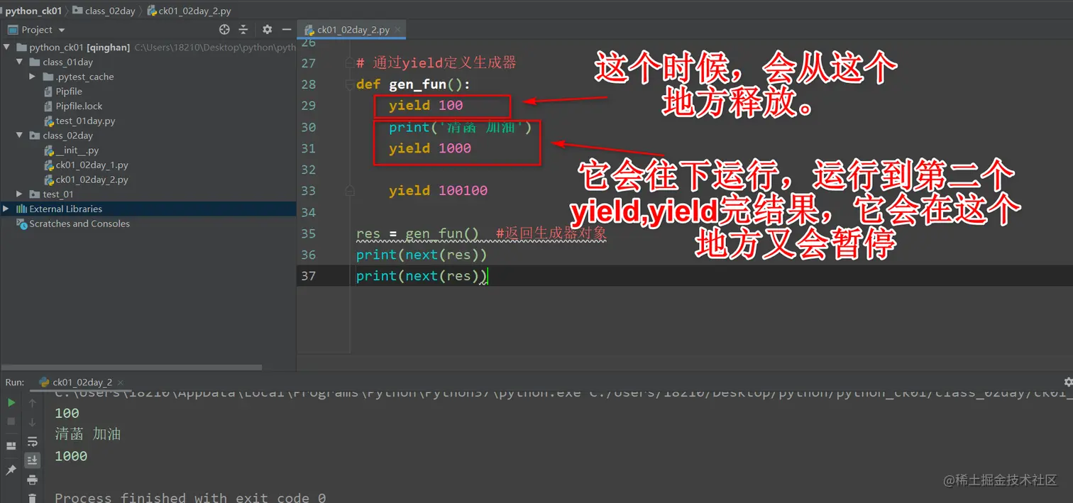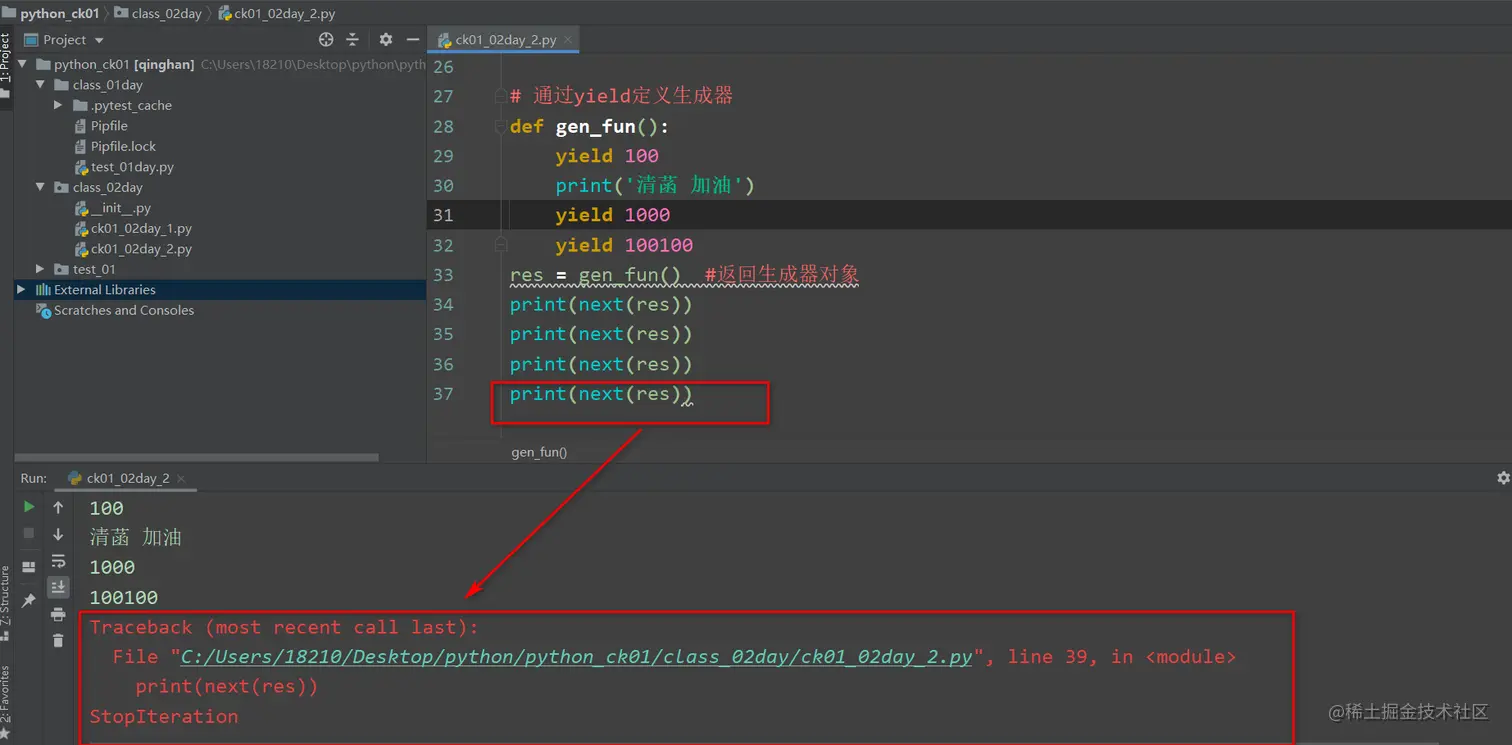 调用这个函数的时候,它会给你返回一个生成器对象。既然它是一个生成器对象,那么就可以通过next()来对它进行取值。