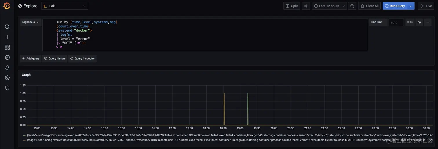 logfmt格式的日志是一个可阅读性较好的结构化格式,LogQL V2的解释器能够直接提取logfmt的日志,下列我们以docker的日志为例子,我们要将error级别中关于OCI运行时报错的内容告警出来: