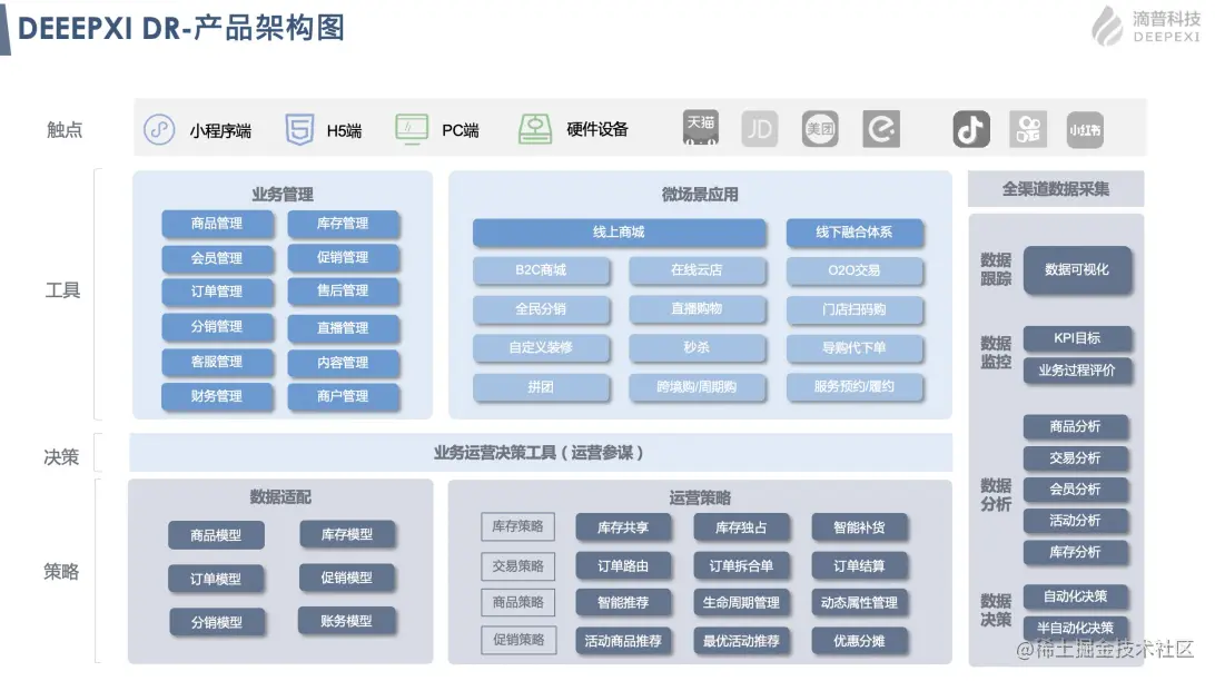 DEEPEXI® DR(Digital Retail)数字化零售平台是一款基于滴普领域中台构建的全渠道数字化零售平台,以数据智能驱动企业零售一体化,实现企业零售业务的全渠道连接和客户的数字化运营。