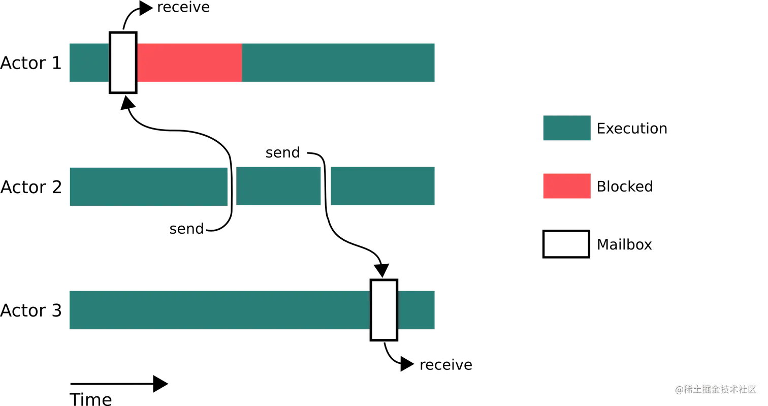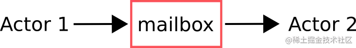 Actor1发送消息到Actor2的邮箱中,邮箱本质是队列,由Actor2消费