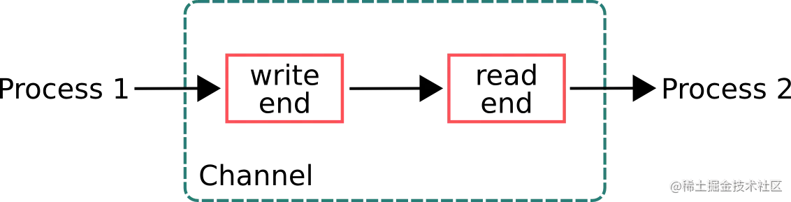 Process1在Channel的写入端添加消息,Process2在channel的读取端读取消息