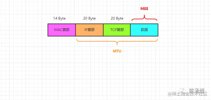如下图所示,MTU 和 MSS 一般的计算关系为:MSS = MTU - IP 首部 - TCP首部,如果 MSS + TCP 首部 + IP 首部 > MTU,那么数据包将会被拆分为多个发送。这就是拆包现象。