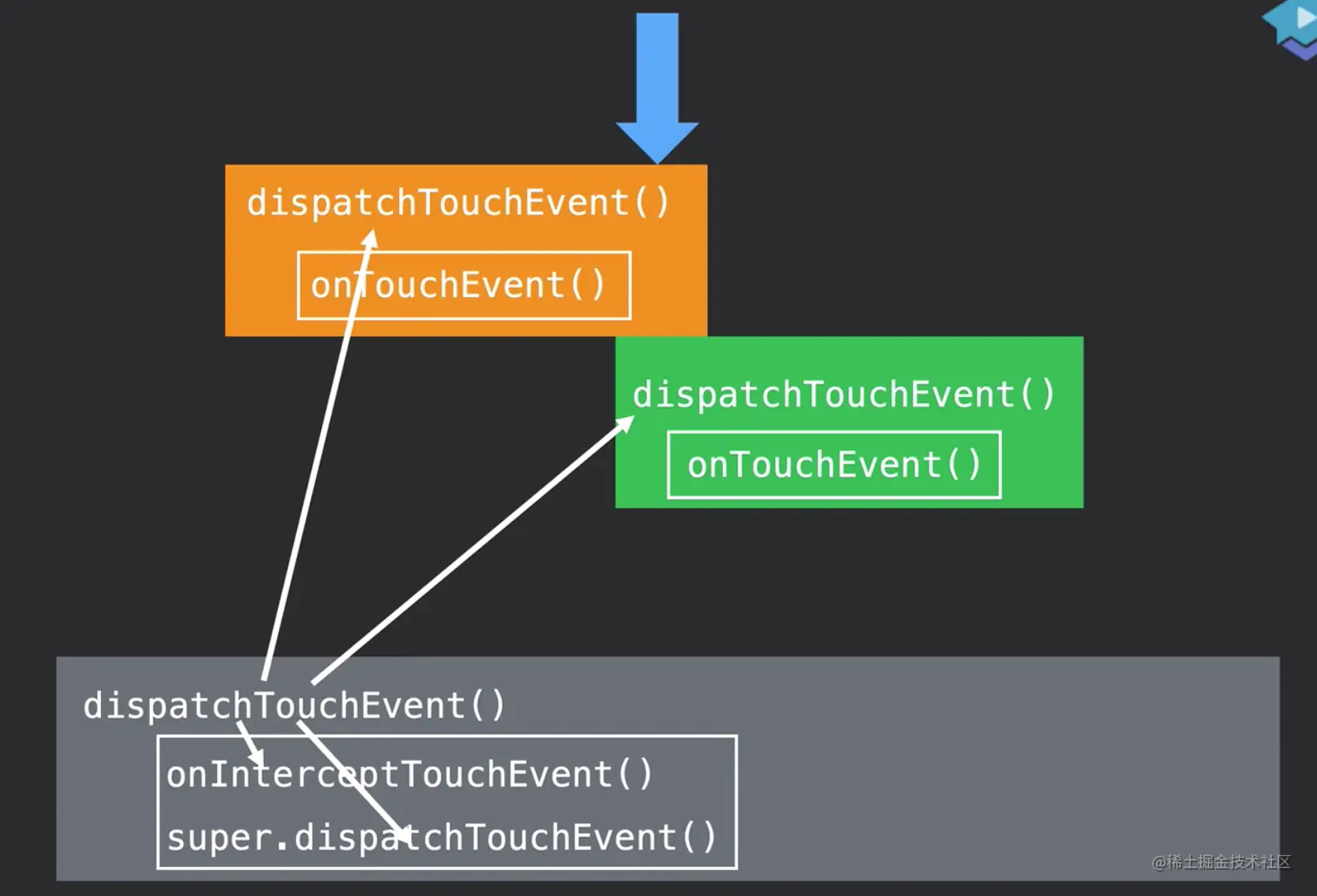 - 如果没有,调用自己的 super.dispatchTouchEvent()