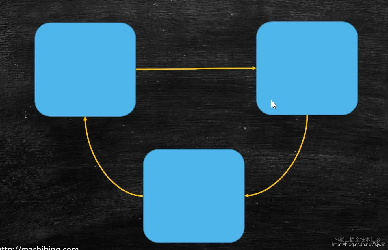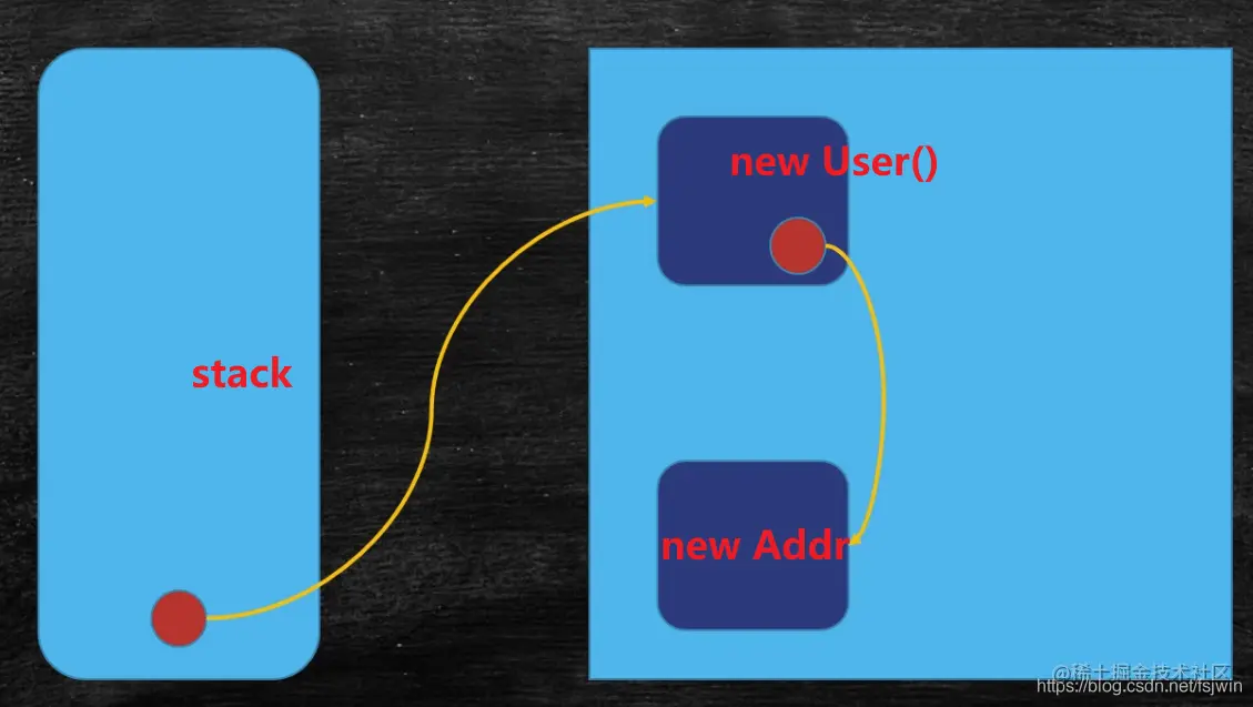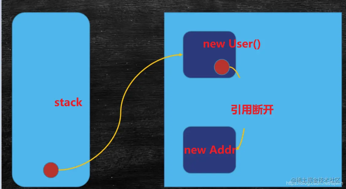 下图是 heap 中的三个对象,相互引用,但是没有其他对象指向他们,他们就是垃圾了。一堆垃圾: