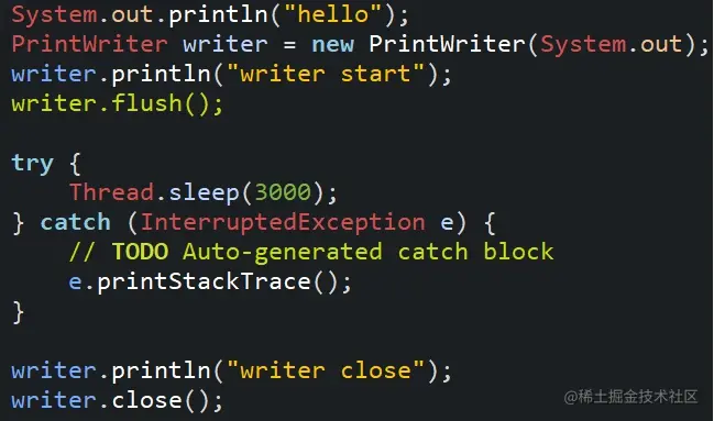 上面的代码如果注释掉flush和close的话只会输出一个hello而不会输出'writer close'