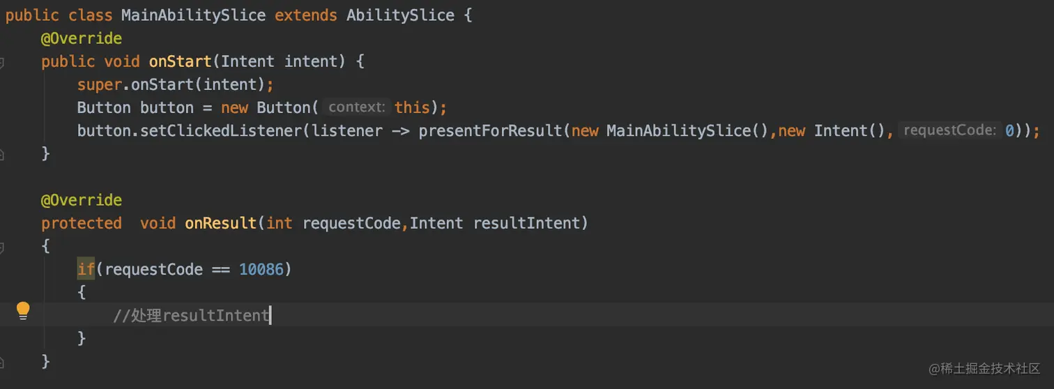 如果跳转需要返回结果,可以使用presentForResult()方法来实现跳转。用户从跳转目标返回时,系统将会回调onResult()来接收和处理返回的结果。此时需要重写该方法。返回结果是由跳转目标AbilitySlice在其生命周期内通过setResult方法进行设置。