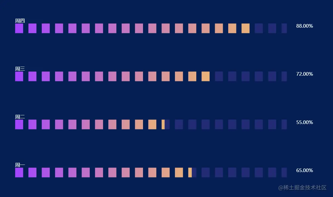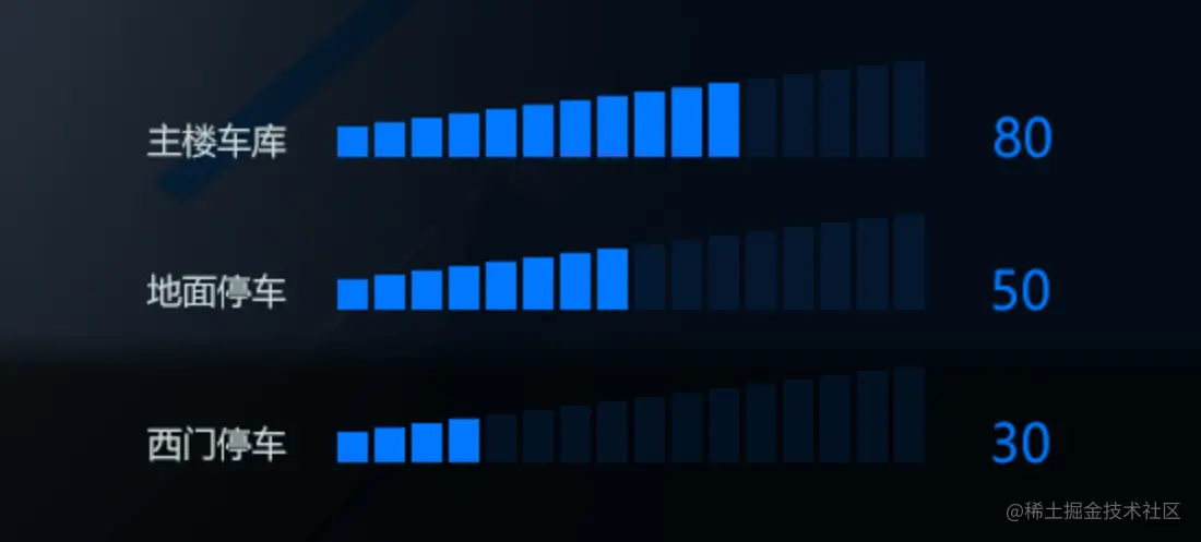 但是在开发项目的时候碰到一个难题,设计稿中有一个图表类的模块,如下图。是一个由多个递增的矩形拼接而成的类似柱状图的进度条,来表示当前车位占用率的图表。