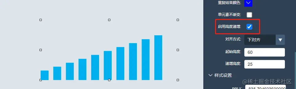 接下来让我们在编辑器中使用来看看。勾选上启用高度递增,对齐方式调整为下对齐,起始高度设为60,递增高度改为25,大功告成