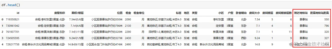 在位置信息中记录的是 小区距离地铁站的距离,我们需要的元数据是 地铁站和距离数字,同样也需要进行分拆。这里需要注意的是,在该列数据中,有部分数据是不含 此类信息的,需要进行特殊处理(这其实就是爬虫过程中解析判断遗留的情况)。