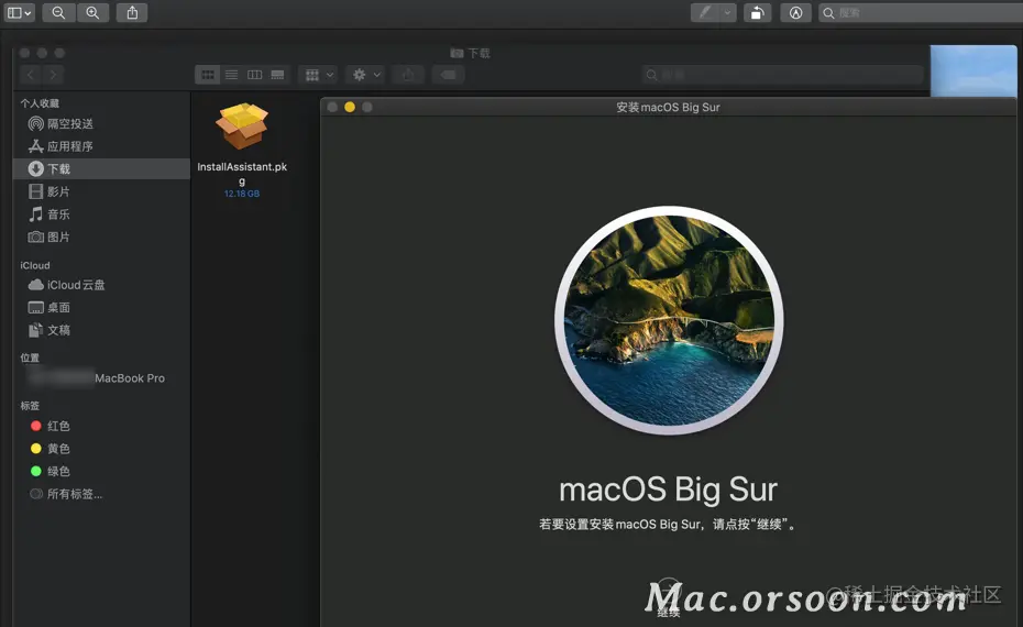 下载的是.pkg文件。双击后,就会弹出你熟悉的Big Sur安装界面,这个是怕新手说为什么下载的不是“安装macOS Big Sur.app”;因为苹果系统有几种安装方式:
