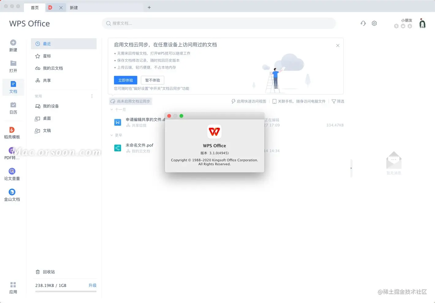 WPS Office 2020 for Mac是由金山公司所发布的一款专业办公套件,wps office mac版集文字、表格、演示、PDF、流程图、思维导图以及海报设计等功能于一体。wps office mac版支持多人实时在线查看和编辑,一个文档,可以多人同时在线修改,wps office 2020 Mac版向用户提供一切高效、稳定、个性化的专业服务,wps office mac版支持多端同步/备份/管理/分享文档,提供多人协作/文档安全管控服务。