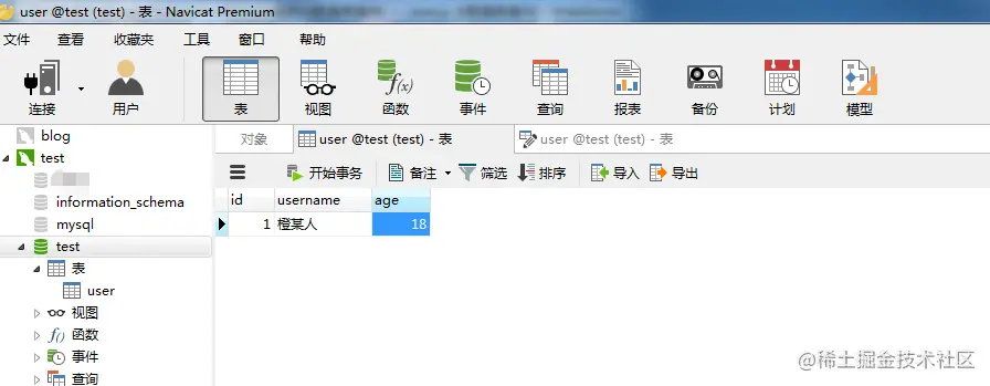 然后借助navicat工具连接上数据库进行可视化操作(如果是大神可以直接命令操作,秀一波),创建一个user表,插入一条数据,如下: