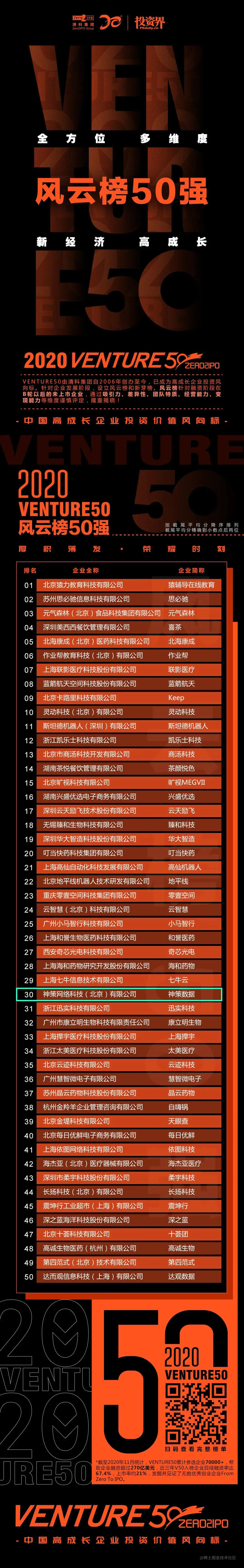 恭喜!神策数据荣登投资界 2020 年 Venture50 风云榜 神策数据 2020-12-18 117 阅读1分钟 近日,投资界 2020Venture50 五大行业榜单惊喜上线,神策数据荣登风云榜 50 强! 据介绍,风云榜企业中超过 80% 在 2020 年度获得新一轮融资,其中不乏大数额融资事件,反映了行业资本向头部明星项目集中的趋势。 自创业至今,神策数据 5 年 5 轮屡获资本青睐,累计融资额 6 亿 +。在 2020 年度的 C+ 轮融资中,A 轮、B 轮、C 轮所有资方全部跟投,领投方襄禾资本创始合伙人汤和松表示:“在我国 To B 市场中,神策数据无疑是一颗耀眼的新星。” 榜单如下: