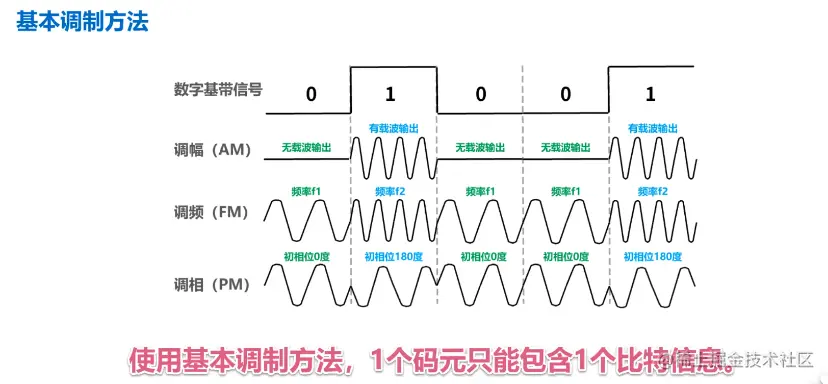 把数字基带的信号的频率范围搬移到较高的频段,并转换为模拟信号,称为调制。调制后产生的信号为模拟信号,可以在模拟信道中传输。模拟基带信号调制后仍为数字信号。