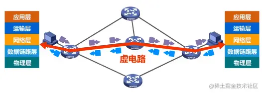 - 虚电路表示这是一条逻辑上的连接,分组都按这条逻辑连接按照存储转发方式传送。而不是真正建立的一条物理连接。