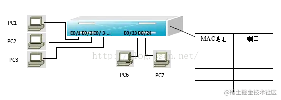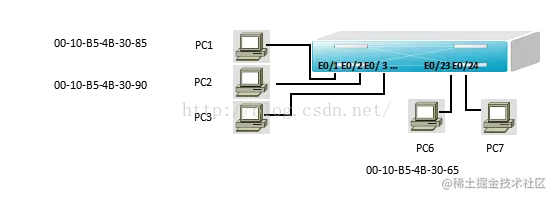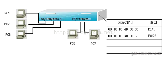 | MAC地址 | 端口 | | ---- | ---- | | 00-10-B5-4B-30-85 | E0/1 | | 00-10-B5-4B-30-90 | E0/2 | | 00-10-B5-4B-30-65 | E0/24| 假设主机pc1向主机pc7发送一个数据帧,该数据帧被送到交换机后,交换机首先查MAC地址表,发现主机pc7连接在E0/24接口上,就将数据帧从E0/24接口转发出去。