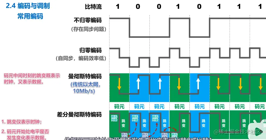 - 曼彻斯特编码:每个码元的中间时刻都会进行跳变。中间时刻的跳变即表示时钟有表示数据(传统以太网)
