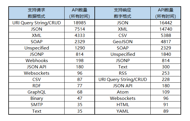 接着说到旧的保守方法,SOAP仍然成功地出现在68个新API中。这里的一个细微差别是基于SOAP的实现总是涉及XML数据格式。但是并非所有基于XML的api都涉及SOAP,很多REST风格的api都支持XML作为数据格式。