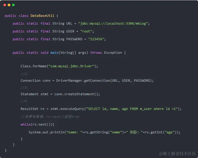 上面代码中知识为了展示JDBC整个过程(异常和资源是简单粗暴的处理了,我们关注的点不在这两个)。