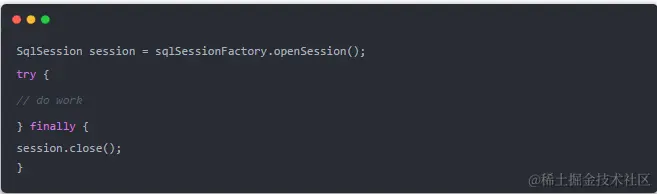 也就是说,在收到一个 HTTP 请求过后,打开 SqlSession,等返回一个回应以后,立马关掉这个 SqlSession。关闭 SqlSession 是非常重要的。你必须要确保 SqlSession 在 finally 方法体中正常关闭。