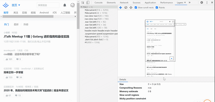 打开控制台More tools,选择 Layers,可以查看页面各层级之间的3D效果图,非常直观易懂。