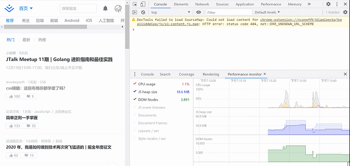 打开控制台More tools,选择 Performance monitor,可以直观的查看DOM节点数、CPU和内存占用等情况。