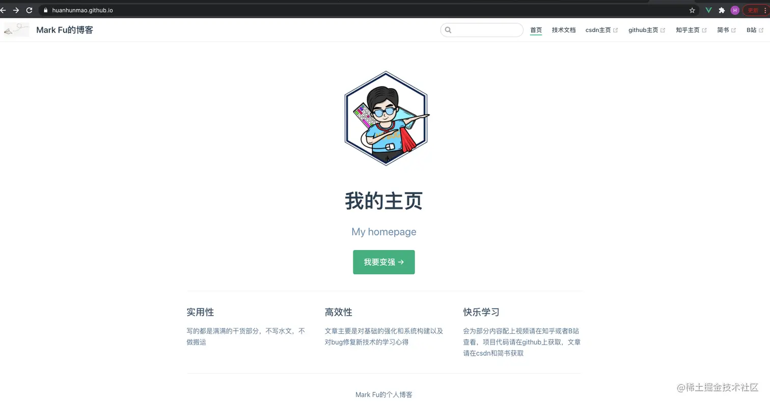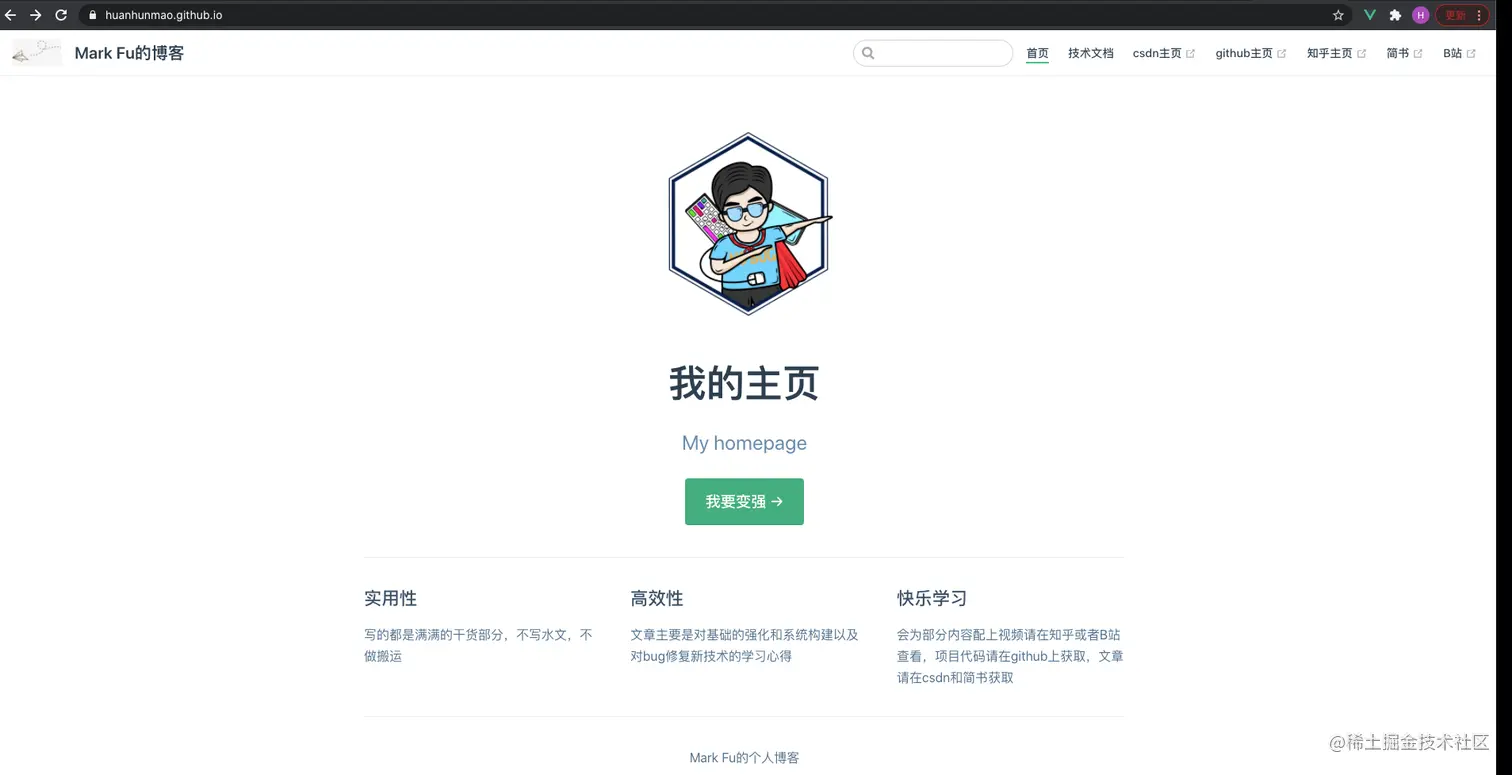 10分钟快速搭建自己的博客教程(史上最良心) 前端付豪 2020-12-18 178 阅读1分钟 PS 我的博客地址 huanhunmao.github.io/ 微信 defeatcc 欢迎交流 1、先说可能出现的问题 1-1 github 第二个放项目的仓库 上线前需要克隆到本地,再把内容放进去就可 1-2 这个问题很常见 很简单 但是找答案很折磨人的 2、下面写一下 整体的流程 看看 大功告成!
