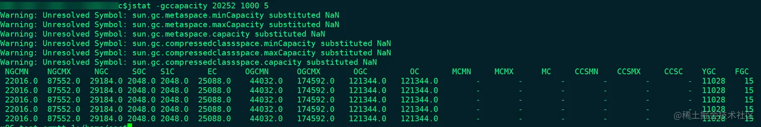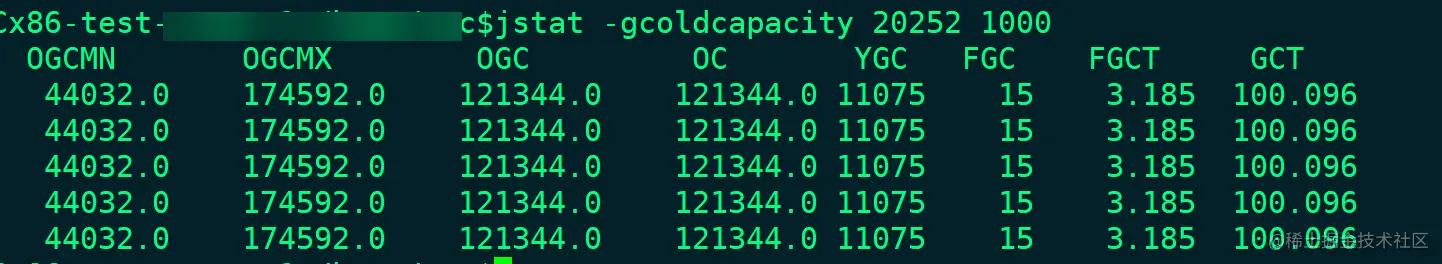 -gccapacity命令主要用来分析堆内存,用法参考上面,如下效果,表头含义参看上面