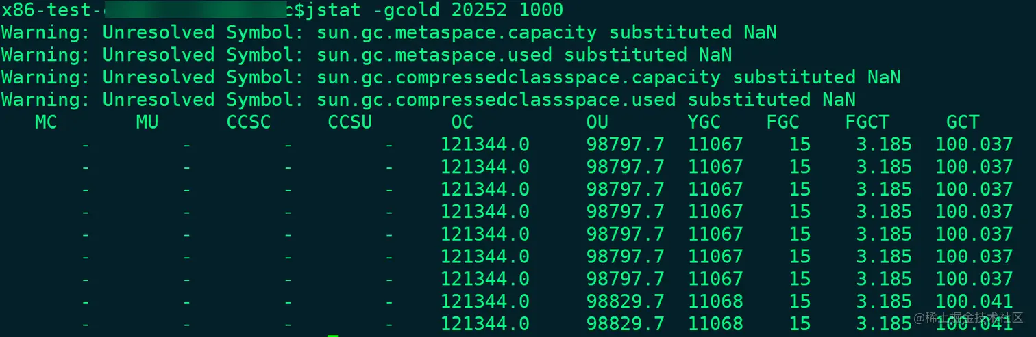 jstat -gc pid即可看到对应Java进程的内存情况,如下: